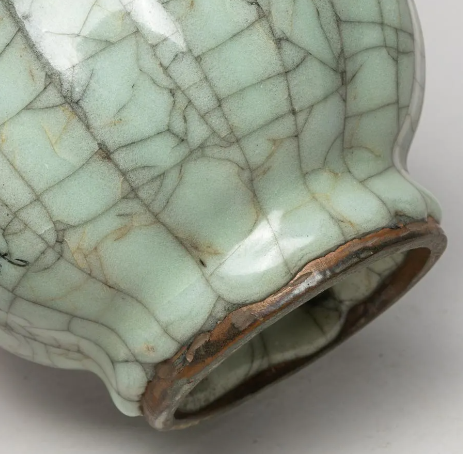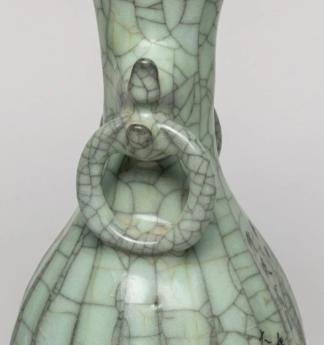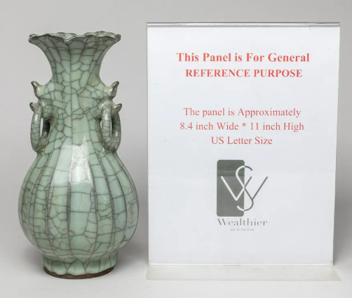 描述 尺寸:H 18 cm 此瓶撇口呈菱花口瓣,双耳,玉壶春瓶样式。瓶身全器满挂仿哥釉,釉质肥润,金丝铁线均匀流畅,底部施釉,足胎坚硬,修整平滑。玉壶春瓶形制规范,瓶腹以瓜瓣修饰。此哥釉菱花口瓣双耳玉壶春瓶,形神具备,制作难度高,应为清代早中期仿哥釉器物。 Description The pear-shaped body of lobed form, rising from a shot foot to a waisted neck and flared rim, set with two faux-ring handles, overall celadon glazed suffused with black crackles, with inscription. Approx. 10.6-5 inch. The Estate of Little Tokyo, Los Angeles, Store Closed Sale, 2021. 哥窑是宋代五大名窑之一。据史料记载,浙江龙泉南宋时有章家二兄弟,均以陶为业,各主一窑,兄所主之窑名哥窑,弟窑亦称龙泉窑。 哥窑瓷最显著的特征是釉色沉厚细腻,光泽莹润,如同凝脂;若置之于显微镜下,可见瓷釉中蕴含的气泡如同聚沫串珠,凝腻的釉面间迸裂有大小不一,或密匝或疏落的冰裂状网纹,其网纹之色浅黄者宛若金丝,细黑者如铁线,二者互相交织,因而被名之为 “ 金丝 ”“ 铁线 ” 。釉色有月白、灰黄、粉青、灰青、油灰、深浅米黄等种类。 宋代哥窑胎质坚细,瓷器口沿尖窄,厚釉在瓷器口沿不能存留,垂釉多在口沿边稍下处形成略微凸出之环形带,因口沿处胎骨略黯而被称之为 “ 紫口 ” ,此为宋哥窑瓷之一绝,尽管元明清仿制者颇多,且各有风格,被称为仿哥窑或哥釉,但在烧制上皆未能臻此绝艺,制作工艺已不能与宋代哥窑相媲美。 记载“哥窑”的古文献主要有:元代的《至正直记》,明代的《格古要论》、《遵生八笺》,清代的《博物要览》以及明代的《浙江通志》等。 清雍正朝的仿哥釉瓷器制作精良,既有标准的大、小纹片相结合的所谓“金丝铁线”,也有单纯的小纹片或大纹片。釉面色泽有粉青、米黄、灰青、灰绿等,并如宋代哥窑瓷釉一样泛“酥油”光。开片中的“铁线”较多,“金丝”较少。“铁线”多呈黑色,或略显蓝色。开片纹路与宋代哥窑瓷器略有不同,不似宋哥釉开片在较小的区域内仍有曲折变化的状态。 常见器形有抱月瓶、贯耳瓶、铺首耳瓶、各式炉、各式尊、盘、碗及笔架、水盂、镇纸、笔掭、各式笔洗等文房用具。器底多署雍正年款。虽然在雍正仿哥釉瓷器中已出现模仿铁箍纹饰的器物,但这种纹饰在清道光以后的仿哥器中更为多见,且一般都属仿雍正之作。