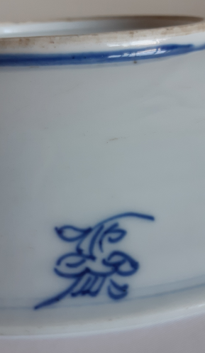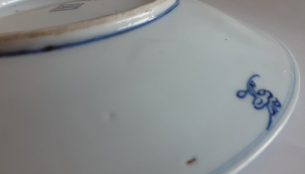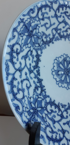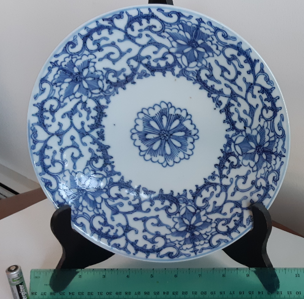 原(购入时的)英文描述: Antique Chinese Ming Dynasty Blue & White Plate Fungus Scroll Design (Longevity) CHINESE MING DYNASTY PERIOD BLUE AND WHITE 10-5/8" PLATE WITH FUNGUS SCROLL SIGNIFYING LONGEVITY, MARKED From my Asian antiques estate collection, I'm pleased to offer this outstanding Chinese blue and white porcelain plate, 10-5/8" in diameter with a fungus scroll decorating the rim. Fungus is an emblem of longevity in the Chinese culture. The plate dates to the Ming Dynasty (1368-1644) and has a seal on the underside. It also has an incised inscription on the bottom. The plate has no damage.