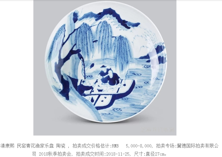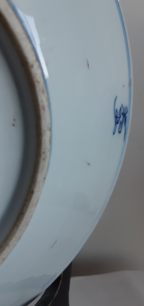 盘子尺寸直径为27cm。 盘子反面可见棕眼和亚光现象,胎质干硬而白净,青花发色淡雅。
