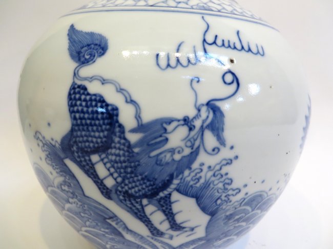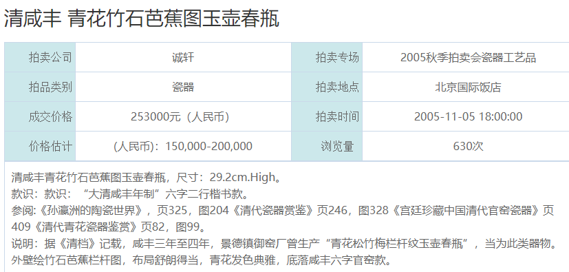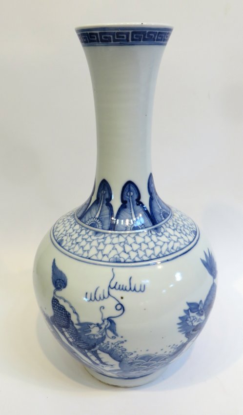 咸丰青花天球瓶 高: 42cm, 最大直径: 21cm. 此青花瓶属于比较大的欣赏瓷器,造型既典型又有所开创,画面具有宫廷画派的特点,极具欣赏价值。画面由青花双圈线分为三部分,底部主画面是五只瑞兽和海花纹饰,瑞兽形态各异,似奔腾跳跃;瓶肩部有似小碎石的图纹装饰,靠近瓶颈底部有一圈变型芭蕉叶纹装饰;瓶口有回纹装饰。画功精细,青花色彩纯正,层次丰富;胎质白净;底部修整规则,落“大清咸丰年制”青花款。 咸丰官窑青花瓷款识,以楷书为主,字体柔美秀丽,一般没有圈或框,多数是青花“大清咸丰年制”六字楷书款,堂名款很少。 咸丰期间,景德镇曾经被迫停烧,咸丰的瓷器就极少。从收藏角度上讲,反而凸显价值。为什么?少!带有“大清咸丰年制”款的瓷器特别少,。 清咸丰年间战乱较多,因此咸丰瓷器的传世品不多,官窑瓷器就更少。这件咸丰年间官窑烧制的青花瓷器具有较高的艺术价值和收藏价值。