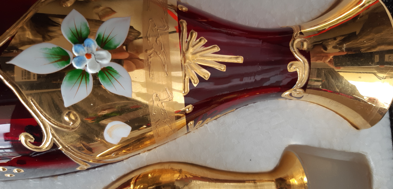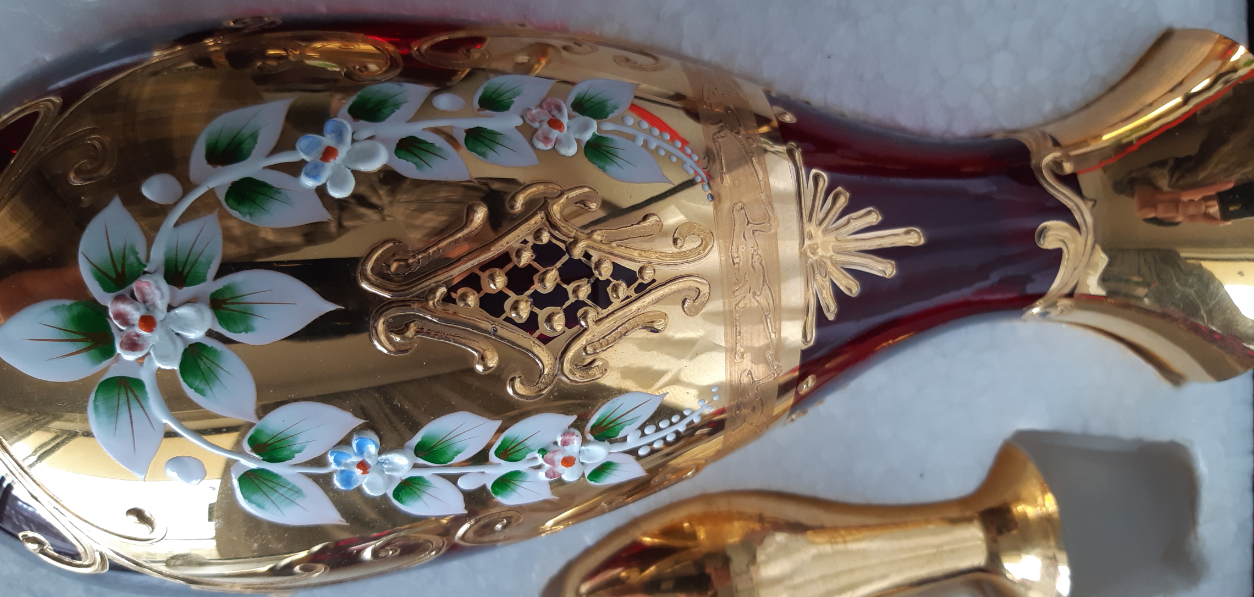 意大利威尼斯手工纯金彩绘宝石红玻璃酒具(一个酒瓶配六个酒杯): 红宝石色玻璃,手工制作,涂金彩绘,涂金厚重。 威尼斯的工艺品中最著名的要数玻璃制品,其制作历史已近千年。但基本原理和制作工艺并没有发生重大改变,工匠们依然保留着传统工艺的手法,制作出晶莹剔透、色泽艳丽的玻璃工艺品。这里出产的玻璃器皿质地纯净,堪与天然水晶媲美,销往世界各国,但是至今仍然没有任何一个国家可以生产出与之匹敌的产品。 最具代表性的就是这种镶金的玻璃杯。各式各样镶着金边的彩色玻璃酒杯和花瓶,奢华,高贵真让人大开眼界,而其中尤以红酒醇厚般色的红色(宝石红),高贵如蓝宝石般的蓝色,两种玻璃制品价格最高,威尼斯独有。 据介绍,意大利人结婚一定要买一对这样的红玻璃酒杯,新婚夫妻用其喝交杯酒。这种镶金的玻璃杯确实很漂亮,但是价格也很漂亮,一对最少要两三千元人民币。这里所有的玻璃器,都是纯手工制作的,欧洲的人工费用极高,所以特别的贵。 参考网站: http://jsnjlw.blog.163.com/blog/static/2251425920123108234664/ |